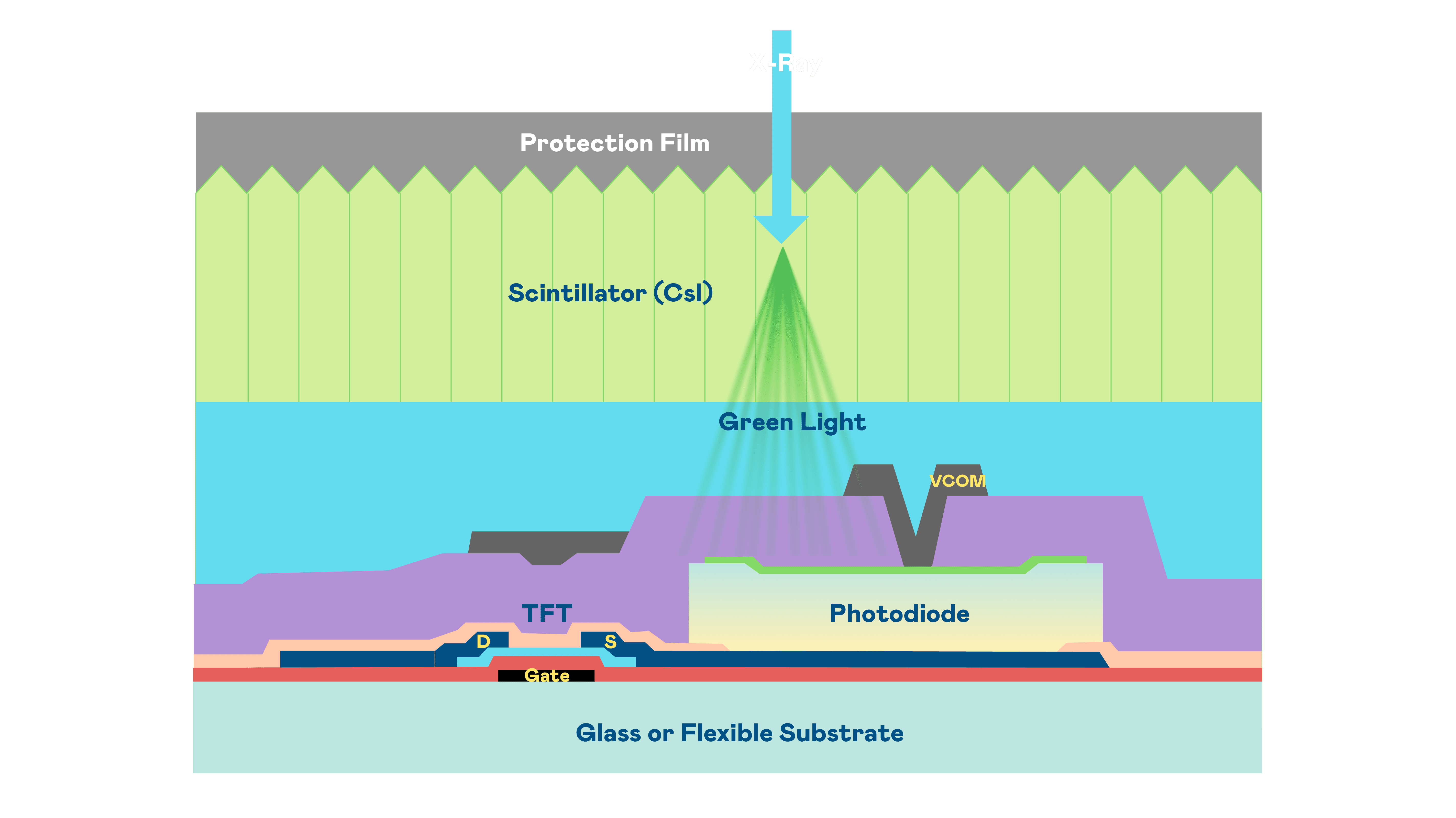 壹号平台的X光影像感测阵列使用薄膜电晶体 (TFT) 作为每个像素的读取开关,,,,搭配光电二极体(Photodiode)的光电转换元件,,,用以感测X光影像讯号。。。