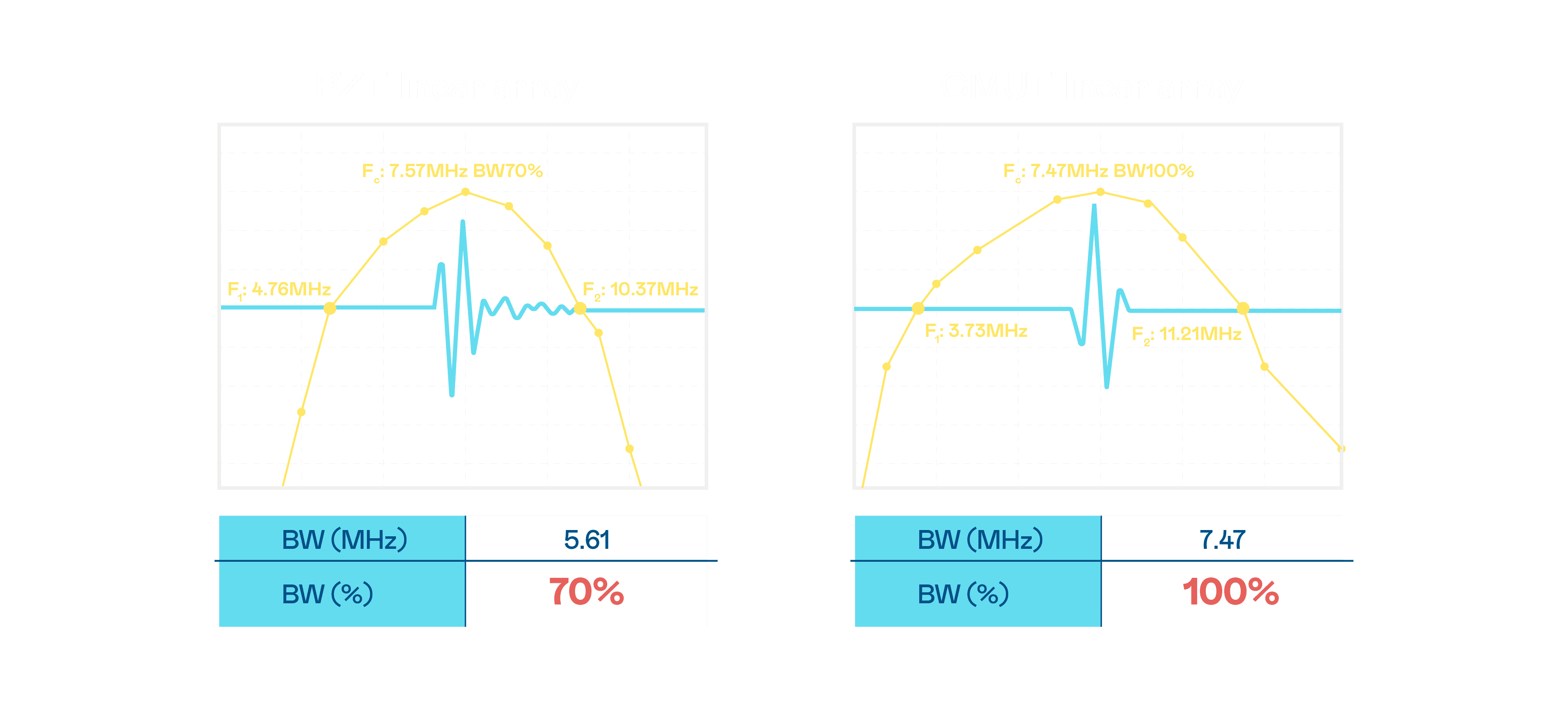 超音波影像的解析度高低,,,首先取决于探头能发出的讯号频宽。。。。壹号平台 CMUT 可提供高清晰的超音波讯号,,提供高频宽、、、、高灵敏度、、、、影像纹理细节更高的超音波影像,,,协助医护人员缩短影像判读时间及利用精准的医疗影像进行诊断。。。。